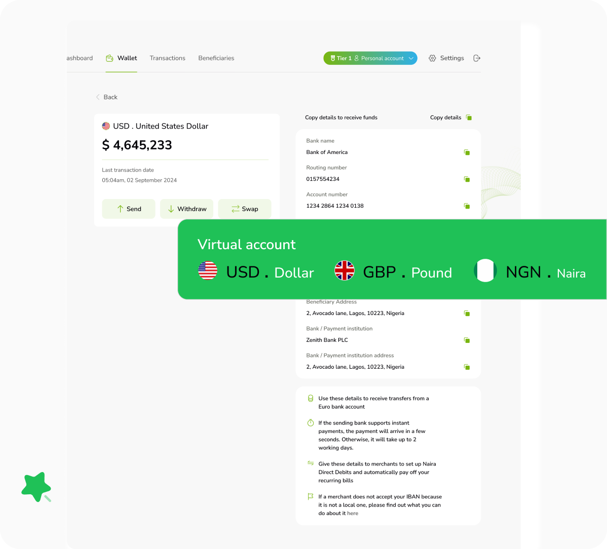 You get unique bank account created in your business’s name to receive payments from clients worldwide. It allows you to hold, send, and convert funds in multiple currencies without the need for physical bank accounts in each country